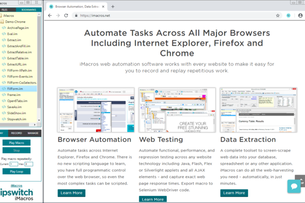 iMacros is designed to automate the most repetitious tasks on the web. If there’s an activity you have to do repeatedly, just record it in iMacros. The next time you need to do it, the entire macro will run at the click of a button! With iMacros, you can quickly and easily fill out web forms, remember passwords, create a web mail notifier, and more. You can keep the macros on your computer for your own use, use them within bookmark sync, or share them with others by embedding them on your homepage, blog, company intranet or any social bookmarking service. The uses are limited only by your imagination!